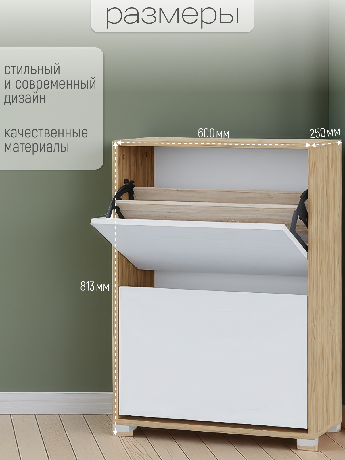 Эта узкая и компактная обувница станет настоящей находкой для небольших прихожих! Размеры модели (60х81,3х25 см) позволяют разместить её даже в самом ограниченном пространстве, сохранив при этом функциональность и стиль. Вместимость до 8 пар обуви до 44 размера делает эту модель практичной и удобной. Изготовлена из качественного ЛДСП в светлых бежевых оттенках — гармонично впишется практически в любой интерьер.